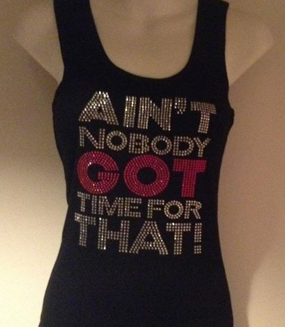 Description AIN'T NOBODY GOT TIME FOR THAT with Clear and Fuschia Rhinestones embezzeled on 27 inch long adult size RIB TANK TOP with 2X1 RIB WEIGHT 100% COTTON
